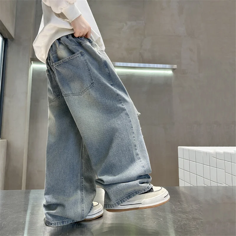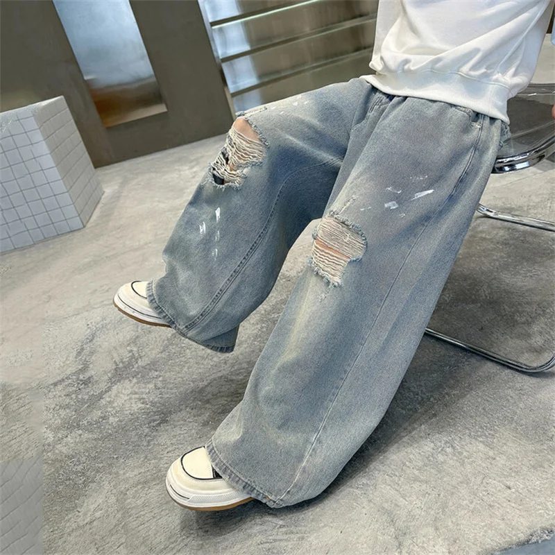 Buy Cool Boys Street Style Ripped Baggy Jeans With Holes on the Knees Kids Child Fashion Broken Denim Pants with Drawings Print.