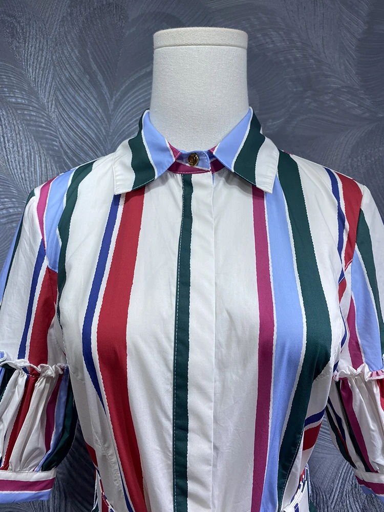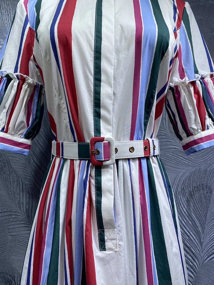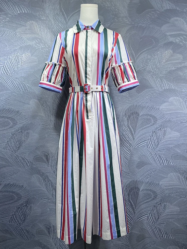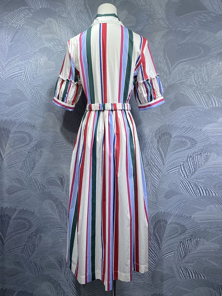 DLDENGHAN Summer Striped Print Cotton Dress For Women Turn-down Collar Short sleeve Sashes Single Breasted High Street Dresses