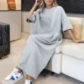 Loose Casual Solid Color Comfortable Cotton Dress Loose Large Size Short Sleeved Shirt Dress Summer Home Long Dresses