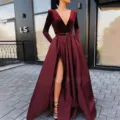 Womens Deep V Autumn Evening Dress Glossy Long Sleeve Waist Bandage High Slit Big Large Swing Dress Ladies Temperament Dresses