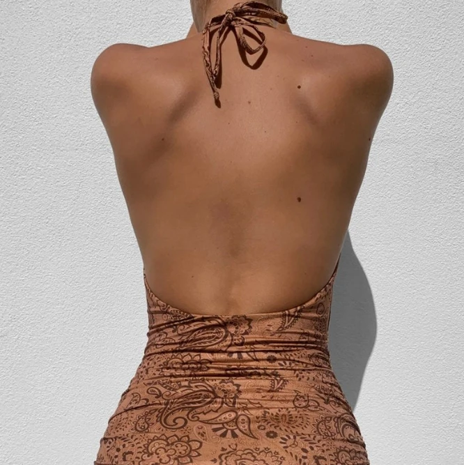 Retro Women’s Dress Basic Street Style Spicy Girl HollowOut Design Sense Retro Printed Bag Hip Dress Maillard Sexy Bag Hip Dress