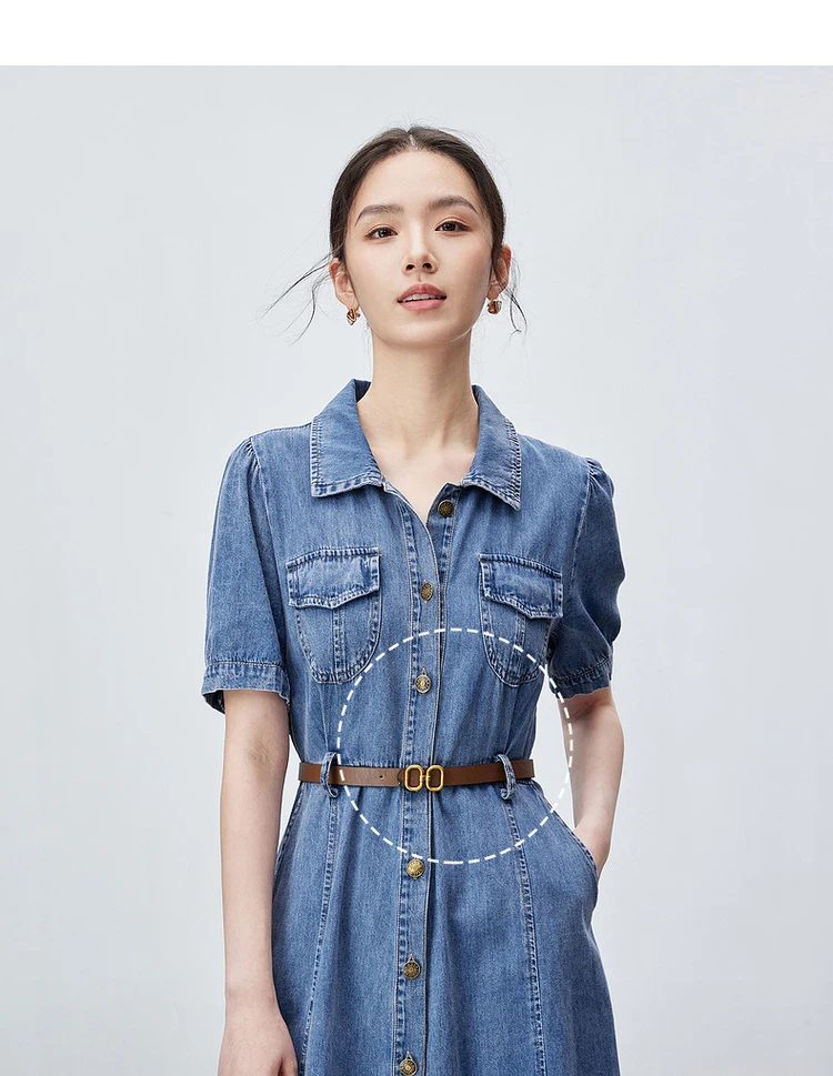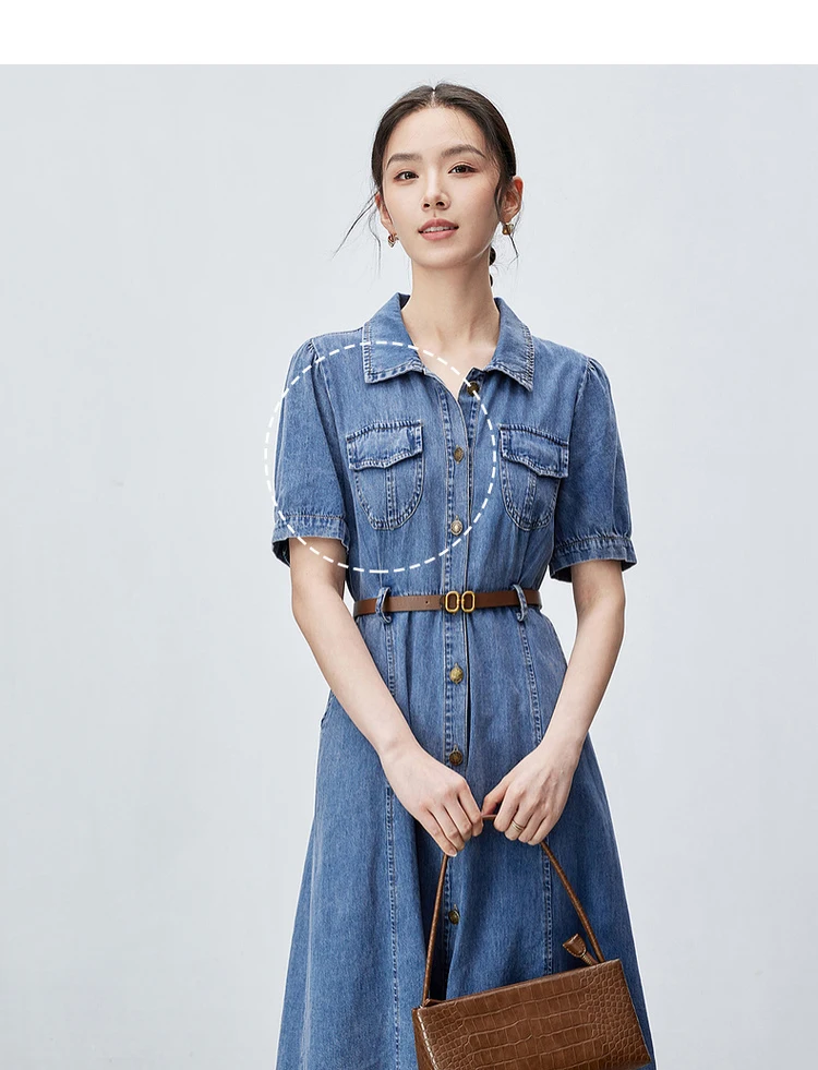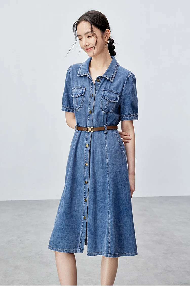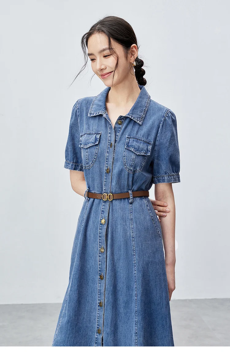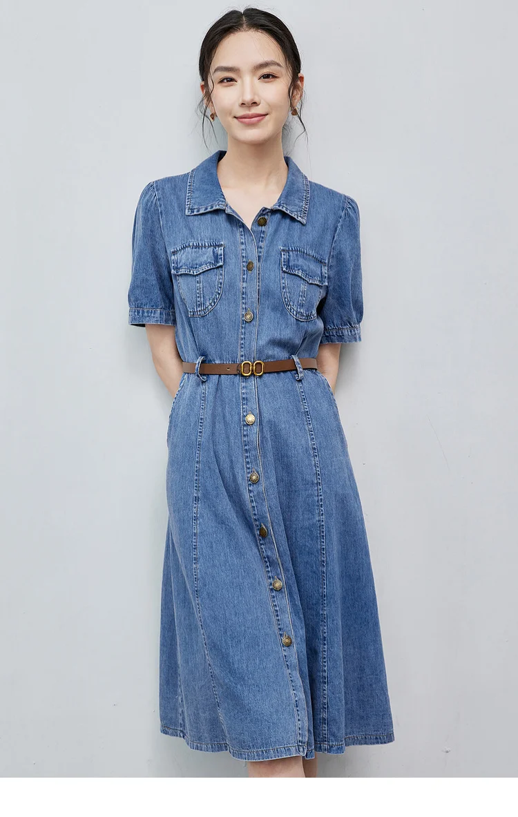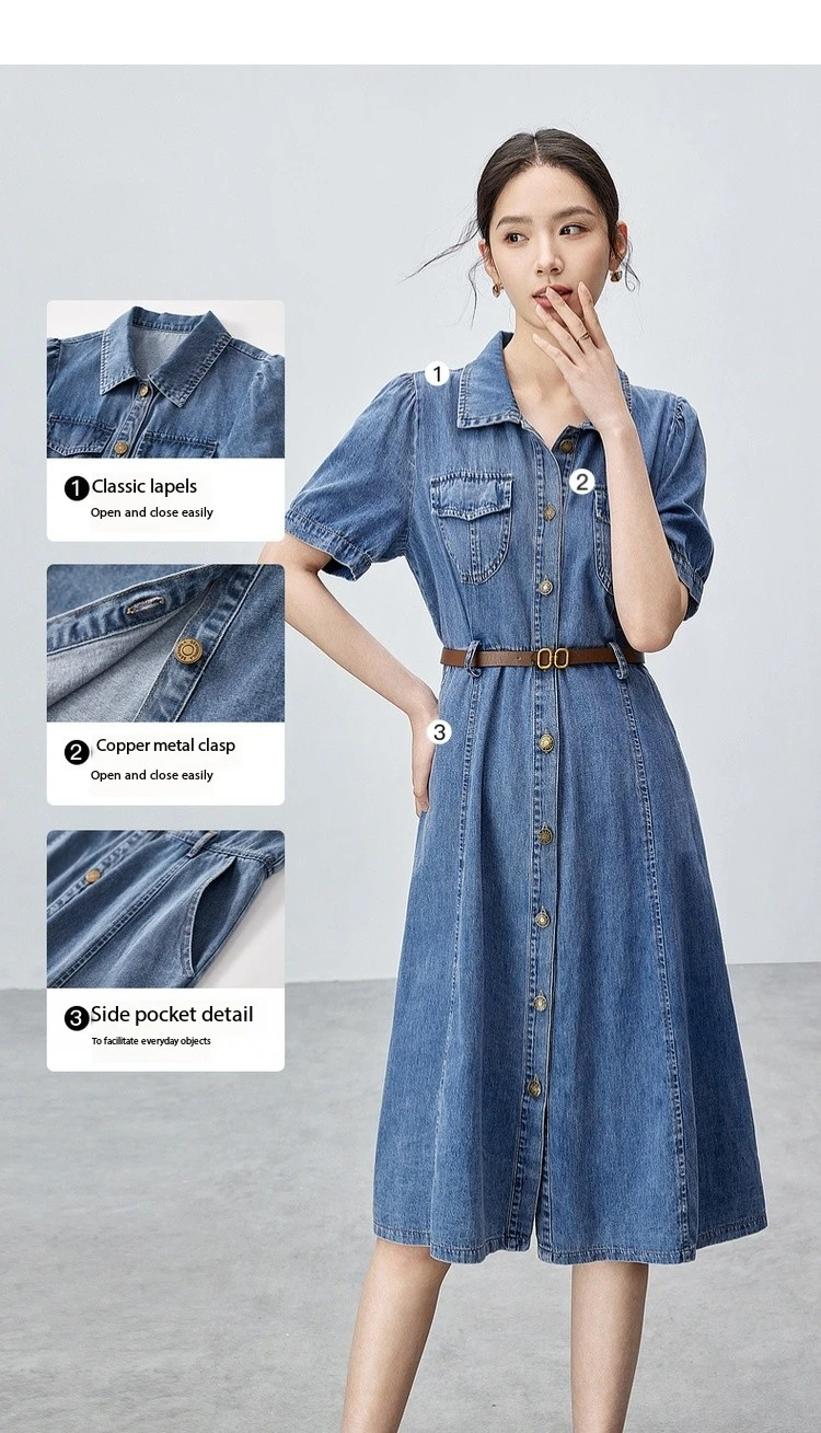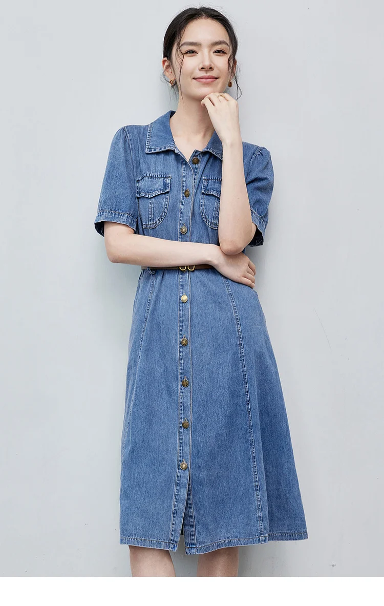 Buy SENTUBILA Summer Denim Dress for Women 2025 Vintage Single Breasted Button-up Short Sleeve Jean Dresses Woman Clothing W42L55389
