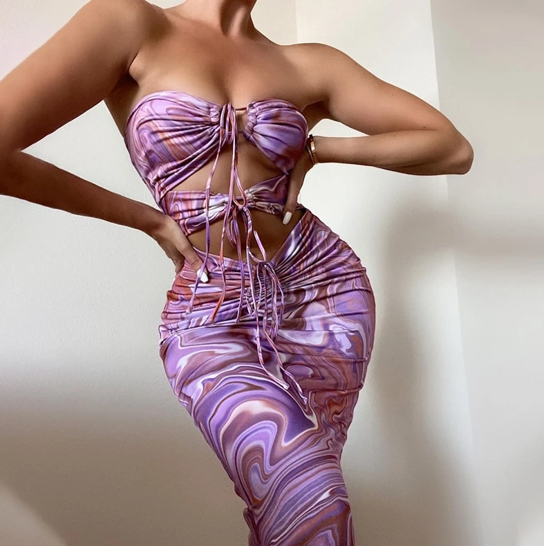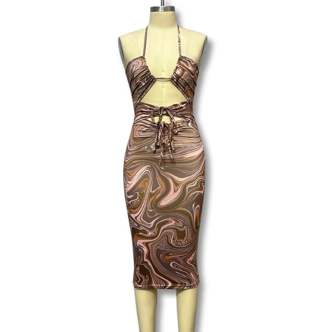 Sexy Hot Girl Summer Women’s Dresses Suspender Hollow Design Printed Lace Up Hanging Collar Bra Sexy Temperament Bodycon Dresses
