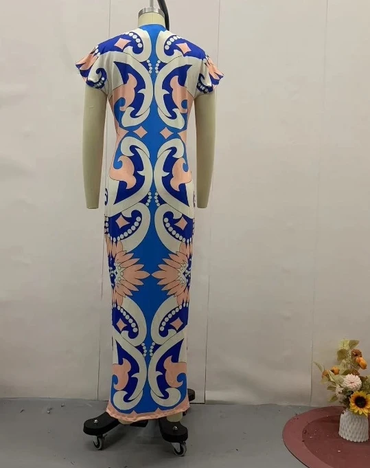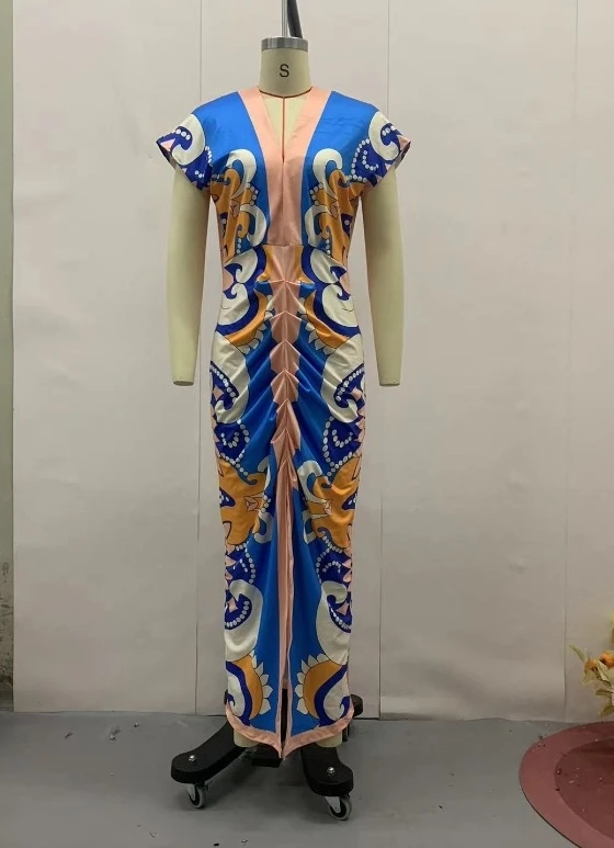 Women’s Beach Dress 2025 Spring Summer Latest Fashion Print Sexy Low Cut V-Neck Hip Hugging Maxi Dress Waist Cinched Long Skirt